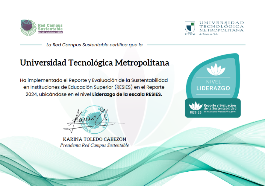 La Universidad Tecnológica Metropolitana obtuvo un puntaje global de 87,33 % en el Reporte y Evaluación de la Sustentabilidad en Instituciones de Educación Superior (RESIES) 2024, correspondiente al año de evaluación 2024. Este resultado constituye el puntaje más alto alcanzado históricamente por la institución y la certifica en el Nivel Liderazgo, la categoría más alta del instrumento, consolidando su compromiso con la sustentabilidad institucional.